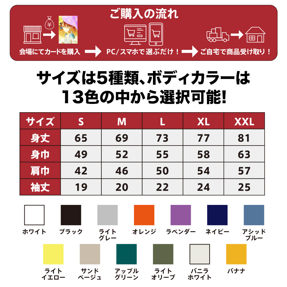 【受注生産】 原画展を記念したオーダーTシャツが登場♪「デザイン:10種」「サイズ:5種」「ボディカラー:13色」から自分好みにカスタマイズが可能です。会場で専用カードをご購入いただき、記載してある専用サイトからご注文いただけます。送料込みの価格表記です。